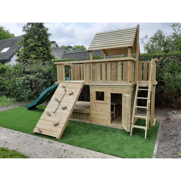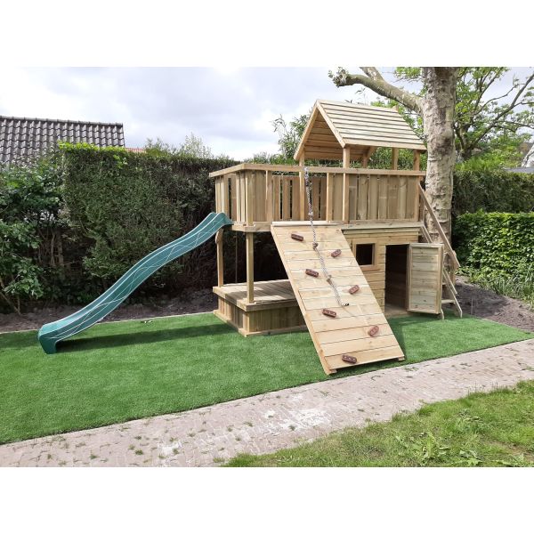 Door een aanpassing tijdens de productie is de glijbaan verplaatst naar links. Hierdoor ontstaat er aan de voorzijde ruimte voor een klimwand. Het klimtouw ter plaatse van de klimwand is bij de klimwand inbegrepen.