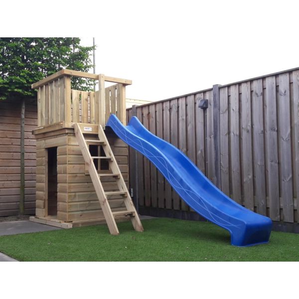Dit speeltoestel is uitgevoerd met een trap met vlakke anti slip treden en glijbaan, beide standaard aan de voorzijde gemonteerd. Tegen meerprijs is het mogelijk de trap en/of glijbaan te verplaatsen naar zij- of achterkant.