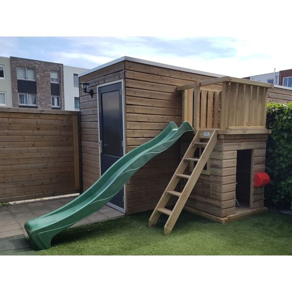 De houten speeltoren is geschikt om uit te breiden. Denk hierbij aan schommels, klimwanden of bijvoorbeeld een brandweer glijstang.
