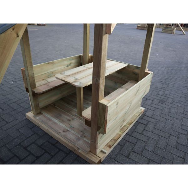 De onderzijde is voorzien van 2 banken en een tafel. Genoeg ruimte om hier met 4-6 personen heerlijk te picknicken. De ingang van de zit kan naar eigen wens gemonteerd worden (voor-, achter-, linker- of rechterzijde).