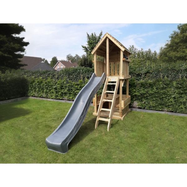 De afmetingen van het speeltoestel zijn 120x120cm. De afglijhoogte van het speeltoestel is 150cm, vanaf hier vertrekt een 3 meter lange glijbaan die leverbaar is in 8 verschillende kleuren.De nokhoogte van het speeltoestel is 3.00m.