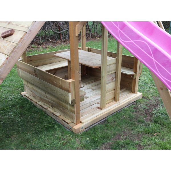 De onderzijde van de speeltoren is uitgevoerd met een houten vloer, een tafel en 3 banken. De grote banken maken het mogelijk heerlijk samen met de kids te picknicken in het speeltoestel. Er kunnen tot wel 9 kinderen op de banken plaatsnemen.