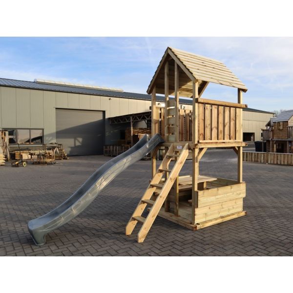Standaard wordt dit speeltoestel uitgevoerd met een trap met vlakke anti slip treden en glijbaan aan de voorzijde. In overleg en tegen kleine meerprijs is het mogelijk trap en/of glijbaan te verplaatsen naar zij- of achterkant.