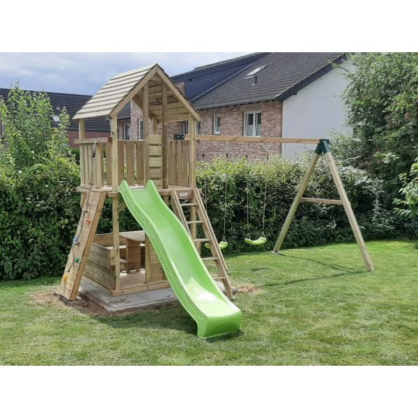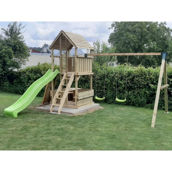 Je kunt zelf het speeltoestel uitbreiden met extra onderdelen (aanbouwschommel, klimwand etc.) of extra's (trapleuning, schoorsteen, etc.). Vergeet niet de schommelzitjes en enkele leuke accessoires mee te bestellen!