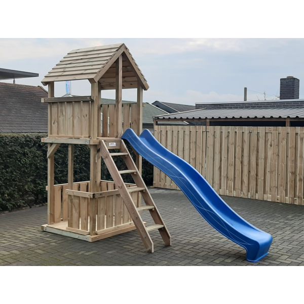 De speeltoren heeft een houten vloer waarlangs een hekwerk gemonteerd kan worden. De positie van dit hekwerk, met name de ingang, kan naar eigen inzicht gemonteerd worden.