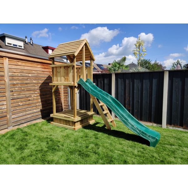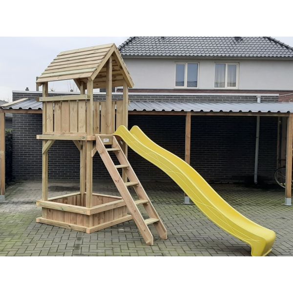 De speeltoren is aan de onderzijde voorzien van een zandbak. Deze zandbak is af te dekken met de bijpassende zandbakdeksel, de deksel kunt u eenvoudig toevoegen aan uw winkelwagen.